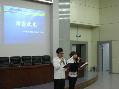 在此次峰会进行的过程中,禁忌书屋 07级音乐表演(歌舞)专业学生刘晓刚、李沛进行了题为《理想之光》的诗文朗诵,与肖珊的演讲相辅相成。