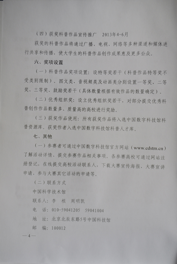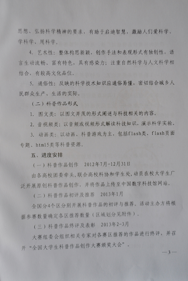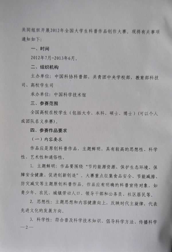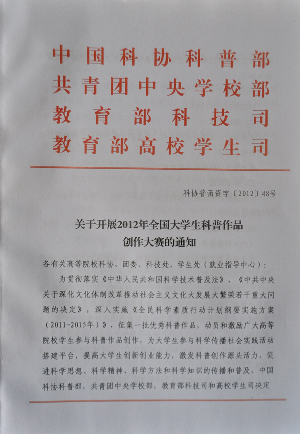 关于开展2012年全国大学生科普作品创作大赛的通知