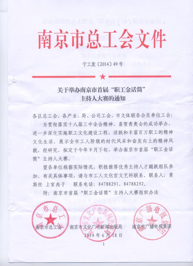 转发《关于举办南京市首届“职工金话筒”主持人大赛的通知》