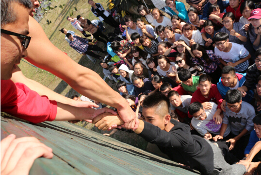 最后的环节是学生们齐心协力,在徒手的情况下翻越高达