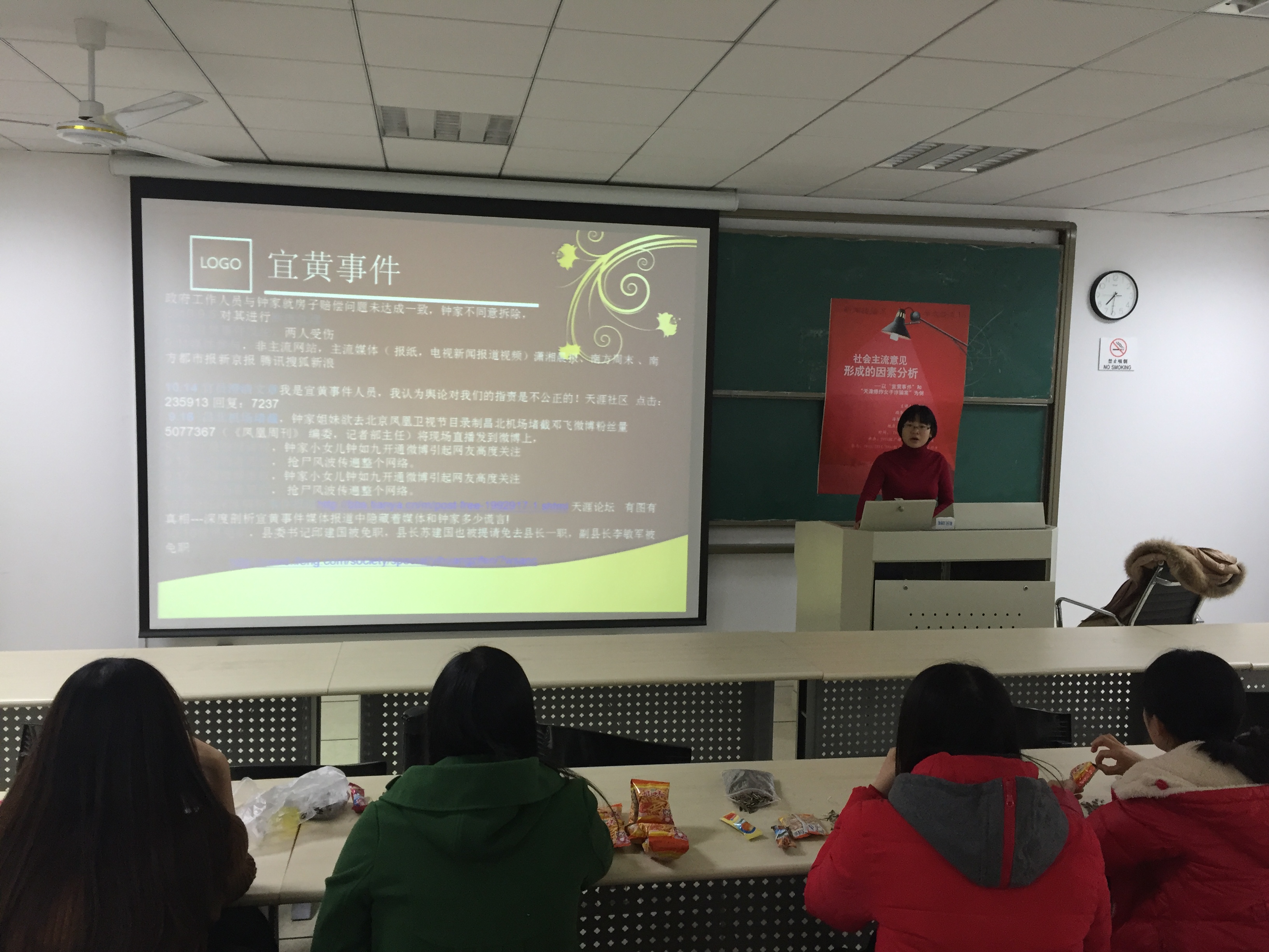 新闻传播系举办了第18次学术沙龙。主讲人樊琴同学以2010年的“宜黄事件”和2014年的“天津爆炸女子诈骗案”为例,带领同学们展开了一场关于公众事件主流意见形成因素的讨论。沙龙以梳理两件公众事件为切入点,结合拉斯韦尔的5w1h理论得出新闻报道不仅要注重时效性,更应注重客观性。讨论由浅及深,一个社会公共事件的发生不是偶然的,必定有其社会政治背景。同时,媒体的议程设置、意见领袖的唇枪舌剑、传统的固有观念的阻碍和政府公信力下降等多种因素的结合,最终造成重大事件主流意见的形成。