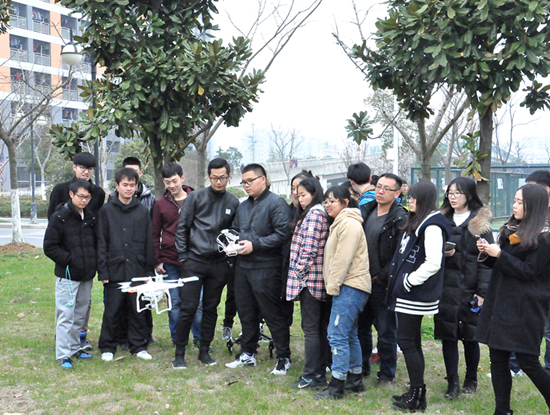 讲座结束后,王钰霖与师生们来到东区南草坪进行了航拍飞行器的现场放飞,并向同学们展示了精彩的飞行技巧,亲自指导现场的学生操作试飞了无人航拍飞行器。现场气氛热烈,同学们都跃跃欲试,轮番上阵操作飞行,表现出了浓厚的学习兴趣。