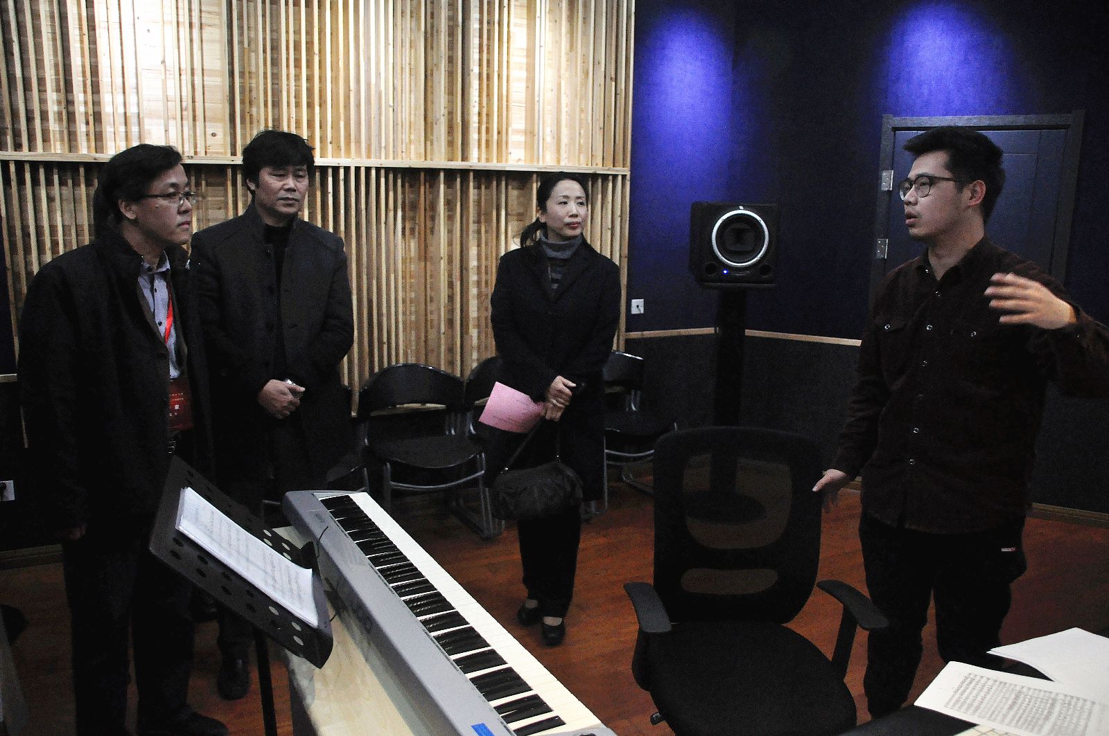 专家组考察禁忌书屋 数字音乐实验室,图为工作人员向专家组介绍该实验室情况