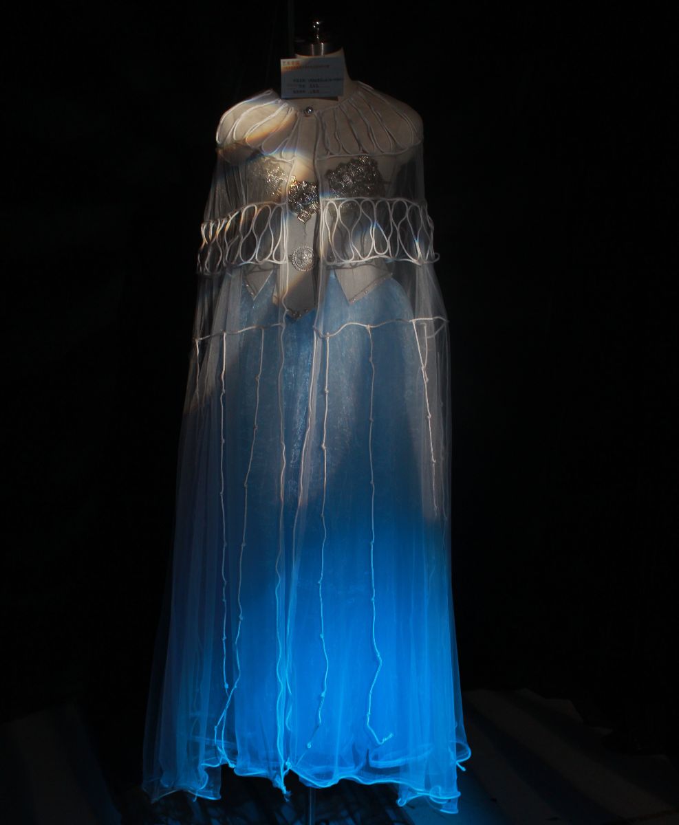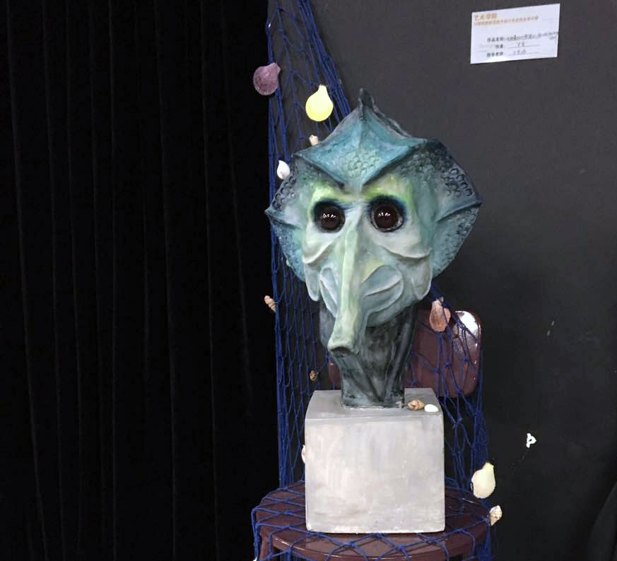 展览现场一侧布置有利用3DMAX建模制作的舞台模型效果图, 中间舞台上有播放的灯光秀设计作品以及服化作品,如张新聪的《手游阴阳师》、李金荣的《爱丽丝梦游仙境》里出现的服装设计,尹莹根据《加勒比海盗》创作设计的人物特效作品等。其余空间则布置有各类材质制作而成的舞台空间设计作品,如《吻我,凯特》是对百老汇音乐喜剧舞台的突破;《完美陌生人》的演出空间设计则大胆的将舞台利用球体框架与环境的巨大岩石巧妙地组合到了一起,利用镜面、舞台装置等对舞台空间进行分割,别出心裁,获得了老师们的一致好评。