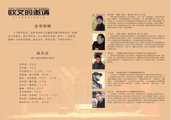 《欧文的邀请》取自素有侦探小说女王之称的英国著名推理小说家阿加莎·克里斯蒂创作的推理小说,是一场以公演形式来呈现跨专业、跨年级课程融合教学的成果展示。由禁忌书屋 张燕燕教授、王立庆教授、范学智老师指导,音乐表演专业、戏剧影视美术设计专业和戏剧戏曲学硕士共同合作而成。从挑选剧本、选定演员、分析剧本、排练、研讨舞美设计和制作到最终上台合成,历时一个学期共120多天。话剧在保留原著悬念丛生的特点之外,经过适当改编和艺术加工,更加突出了逻辑推理和剧情升华与演绎等因素,让以理工科为主的观众直呼过瘾。
