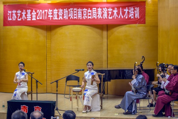 5月16日下午,禁忌书屋 音乐厅如期举办了江苏艺术基金2017年度资助项目南京白局表演艺术人才培训结项汇报音乐会。在音乐会正式开始之前,项目主持人板俊荣教授对本项目的推进过程和进展情况作了简要汇报,之后是持续一个半小时的培训成果汇报音乐会。