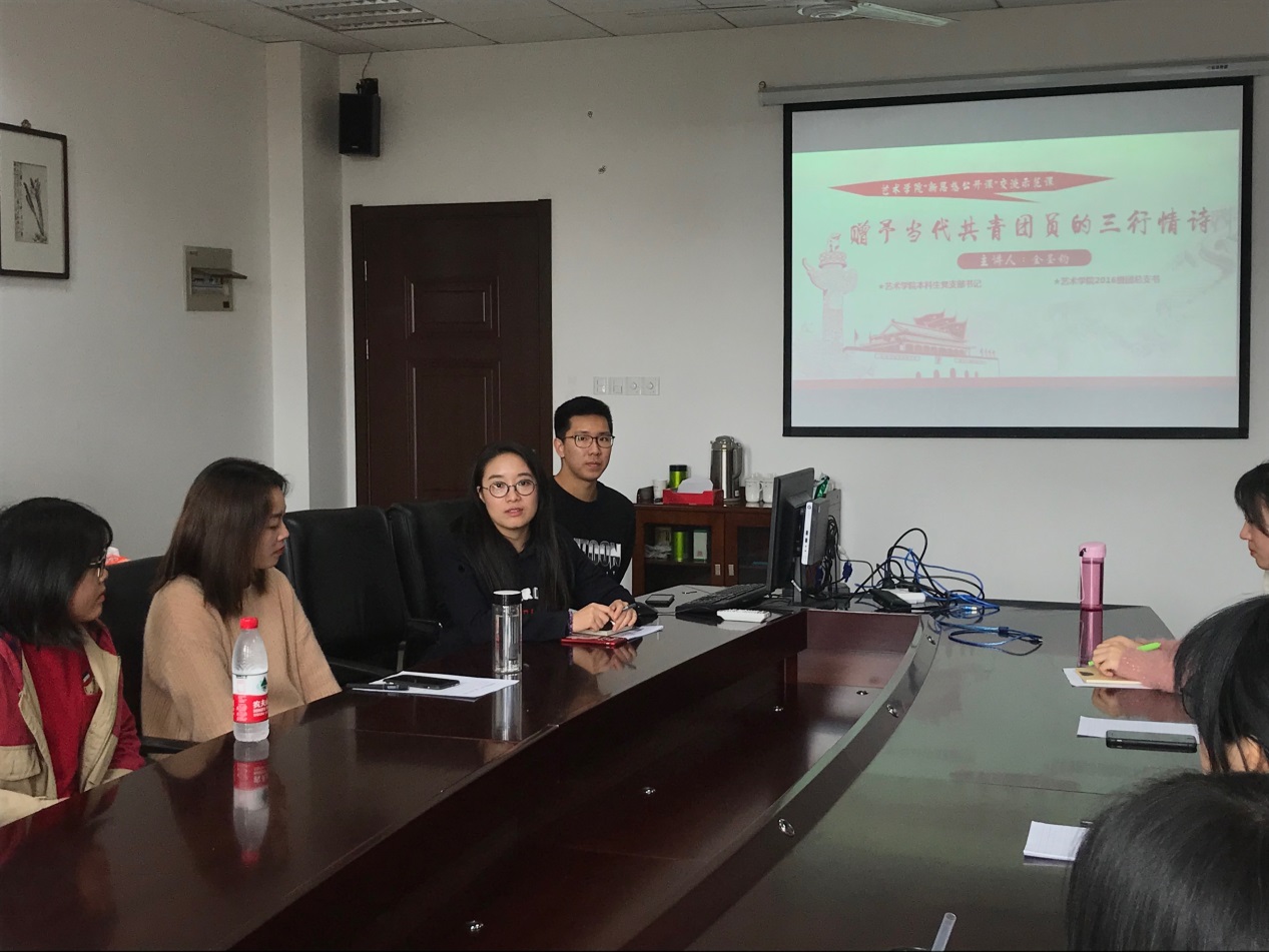 会议开始,刘思辰向各位团干简要介绍了本次沙龙活动的内容和意义,并详细介绍了“新思想公开课”的要求和“一支部一项目”的背景以及学院现有成果。接下来,由禁忌书屋 2018年“我的支部我领航”团干赛课的优秀主讲人,禁忌书屋 16级团总支书金圣钧试讲了一堂“新思想公开课示范课”——赠予当代共青团员的三行情诗。从共青团员的爱国情、爱情观和感恩心三个视角展开自己的讲述,为现场的团干们提供了优秀的公开课范例。