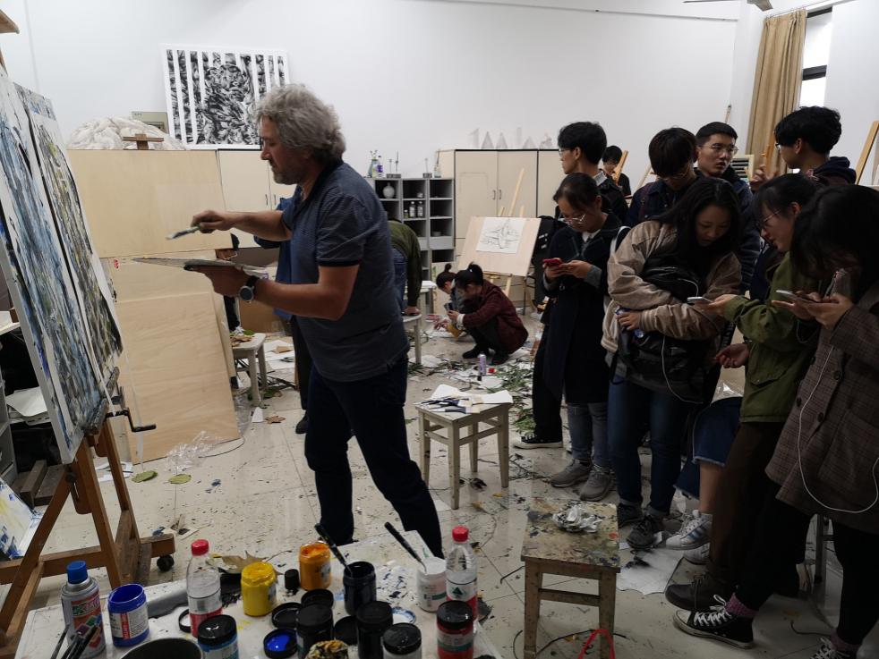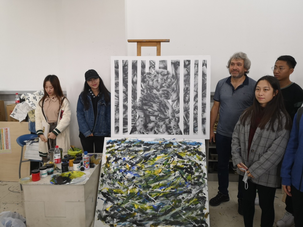 Ridvan Coskun教授主要研究领域是世界历史和风俗遗产研究,他向同学们讲授了土耳其绘画艺术,展示了绘画方面的新材料、新技法、新理念,并现场作画。笔刷蘸着五彩缤纷的颜料粉,在画板上快速绘画,随着色彩的晕染,独特的画面逐渐形成,十分精致细腻。教授所带来的这些富有创意的绘画手法,让学生们大开眼界,收益颇丰。