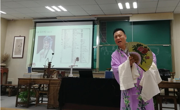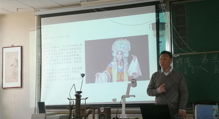 彭林刚老师带师生们欣赏了许多京剧和昆曲的唱段,也亲自演唱了许多经典的唱段,如京剧《贵妃醉酒》、昆曲《惊梦》、《寻梦》和《牡丹亭·离魂》等,彭老师精彩的演唱赢得了师生的热烈掌声。