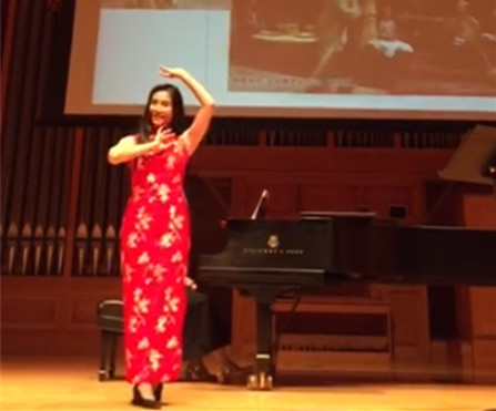 音乐会在江苏民歌《茉莉花》的背景音乐中拉开序幕。张进老师一袭红色旗袍走入舞台,神采奕奕,声情并茂,娓娓道来。她向观众们介绍了具代表性的中国艺术歌曲及其表达的传统文化内涵,以及中华民族的民族区域分布和各地民间音乐特质,她解读了新疆地区哈萨克民歌《燕子》、维吾尔族民歌《阿拉木汗》、江苏民歌《茉莉花》等具有鲜明地方色彩的民歌的曲调特色、文化意蕴,使观众们对中国民歌有了初步的认识。