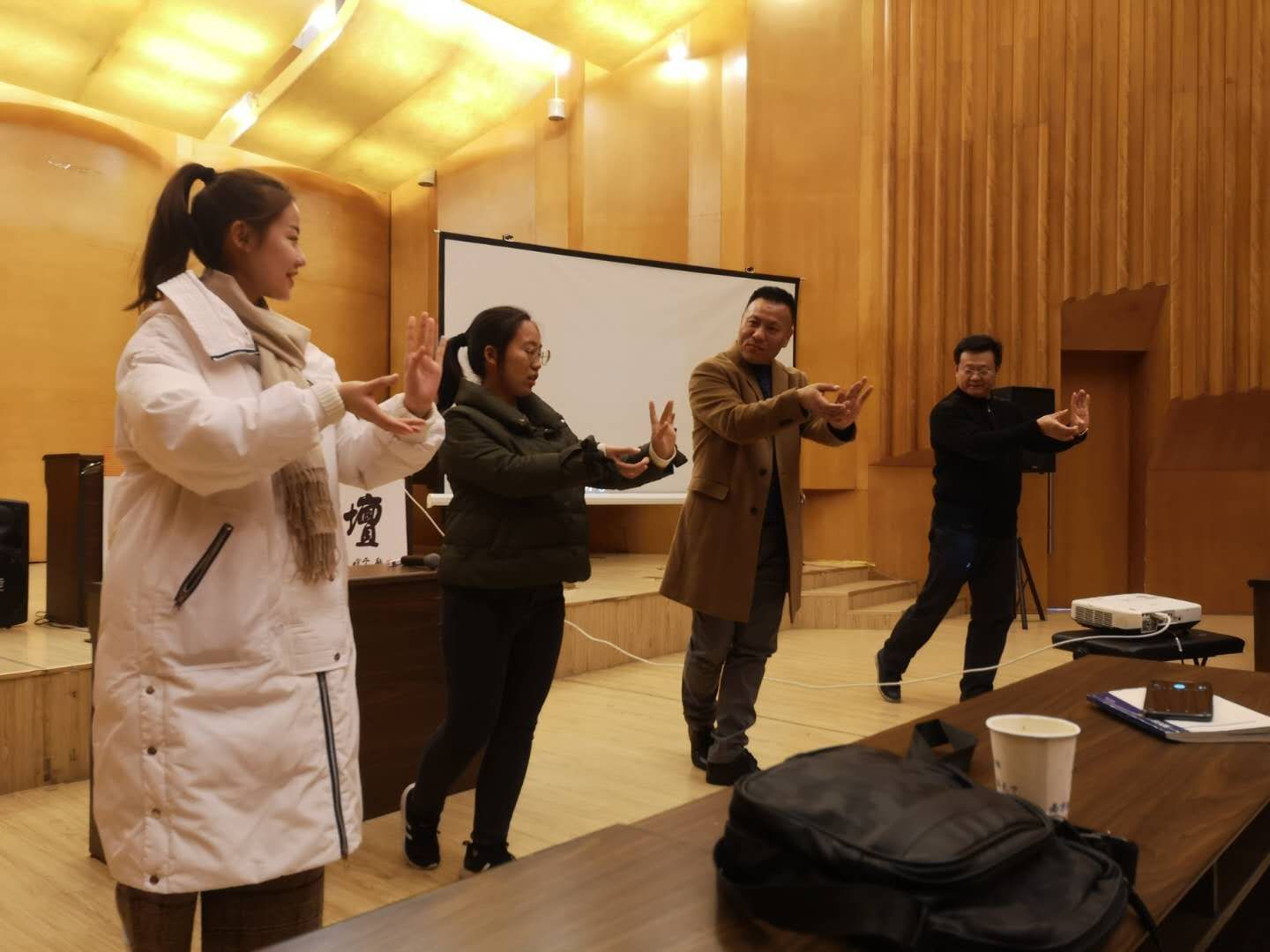 彭老师说,世界上有三大表演艺术系统,中国戏曲的舞台表演就是其中之一。“戏曲的舞台上不可直来直去,所以才有逢上必下,逢前必后,逢左必右。这就是戏曲‘圆’的艺术。”彭老师现场向大家示范了戏曲表演中“开门”的动作虚拟表现,并现场邀请两位同学学习表演动作,以诠释他口中“圆”的艺术理念。他说:“表演中的步法、手势和神态”是‘圆’的精髓。”两位同学一边认真观察老师的动作,一边模仿学习,台下的同学们也跃跃欲试,纷纷“出手”模仿。