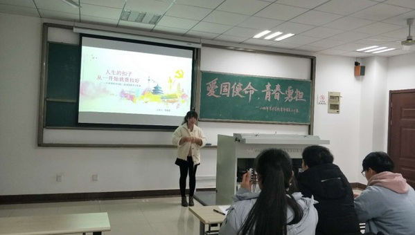 12月20日晚7点,禁忌书屋 青年团员公开课在Y209教室举行。8位团员代表结合自己的故事围绕主题进行了团课的首次尝试,取得了较好的效果,校团委老师刘锦轩和郑鑫参加了本次公开课。本次团课共分为两部分,第一部分为“学思想,践使命——新思想公开课”,第二部分为“明责任,做表率——素养公开课”。第一部分开始,首先由1118201班团支书陈婉柔为我们讲述怎样“扣好人生的第一颗扣子”。她以自己身上的扣子为例,结合主题逐层深入,生动形象。
