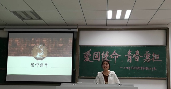 随后,1118101班汤思雨结合文化自信为我们讲述了一堂鲜活的艺术课,主题为“艺术——文化自信承载中国梦”。贤人古训,句句箴言深入心中,让文化艺术与中国梦紧紧相连。