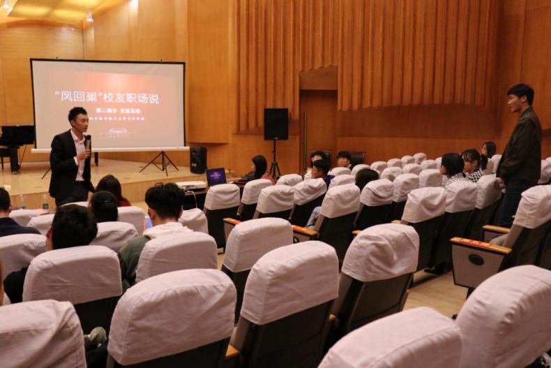 首先是张家港电视台首席主持人史富春校友上台分享。对他来说,在南航的历练是一个成长的过程。作为一名音乐表演专业零基础学生,从美术专业转到音乐领域的他起初是迷茫、自卑的,但在老师与学长的鼓励下,“不怕出错,不怕被取笑,要有我能行的态度”成为了他的坚持。他希望学弟学妹们都能在南航的综合素质培养下成为一个自信阳光、敢于挑战自我的人。在他的主持生涯中,能作为一个非专业选手脱颖而出,站到今天的高度,综合素质的培养和对主持事业的热爱与坚持都起到举足轻重的作用。史富春说:“我学到的每一块看似微不足道的内容都在求职过程中给了我极大的竞争力与优势,这也是为什么大学之中没有‘无用的学习’。”