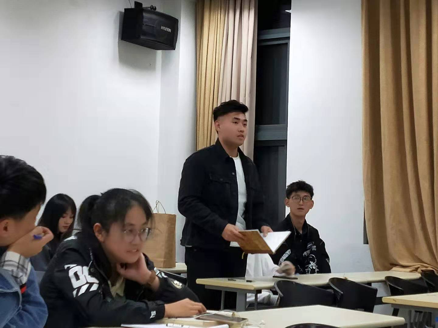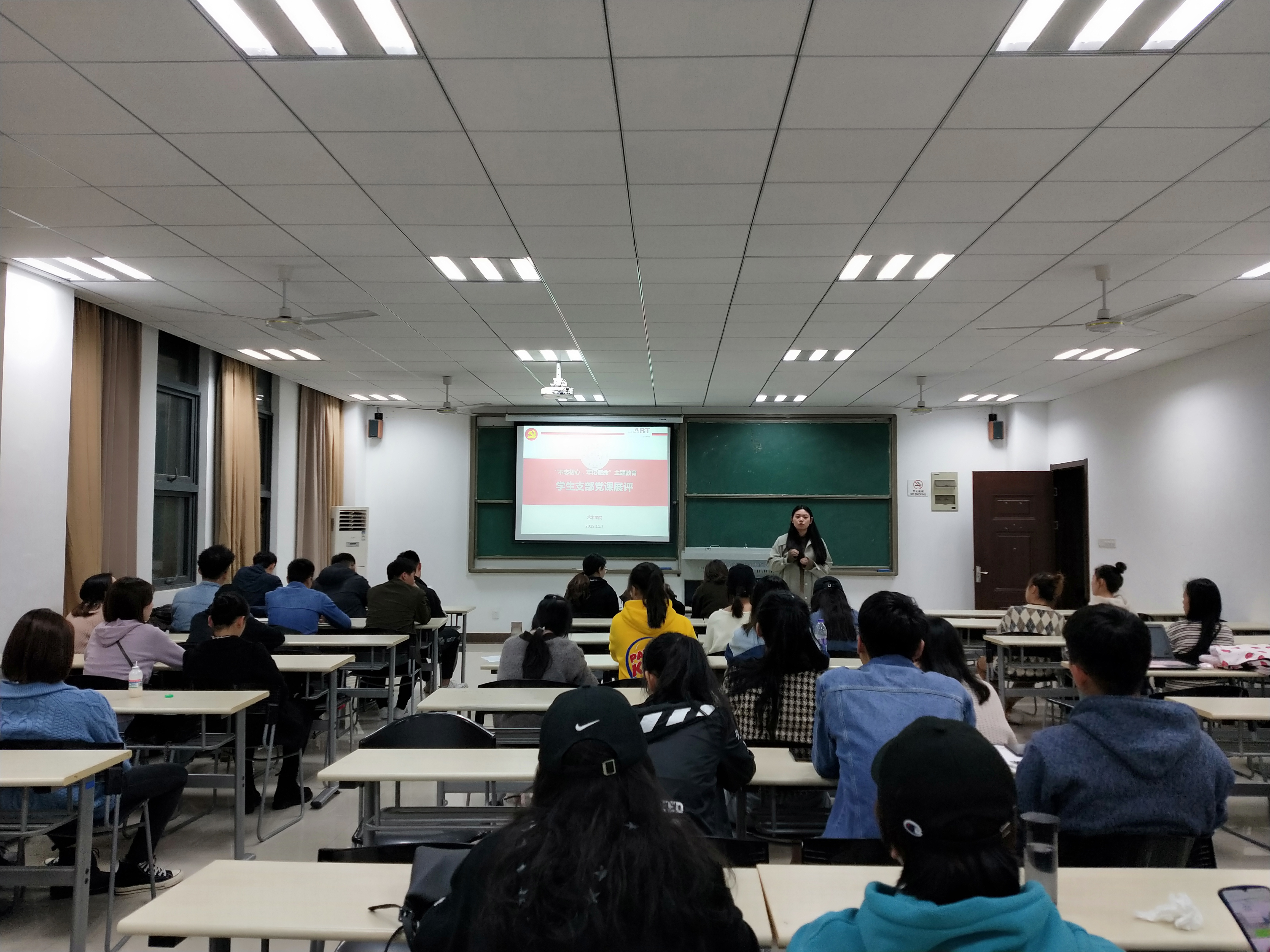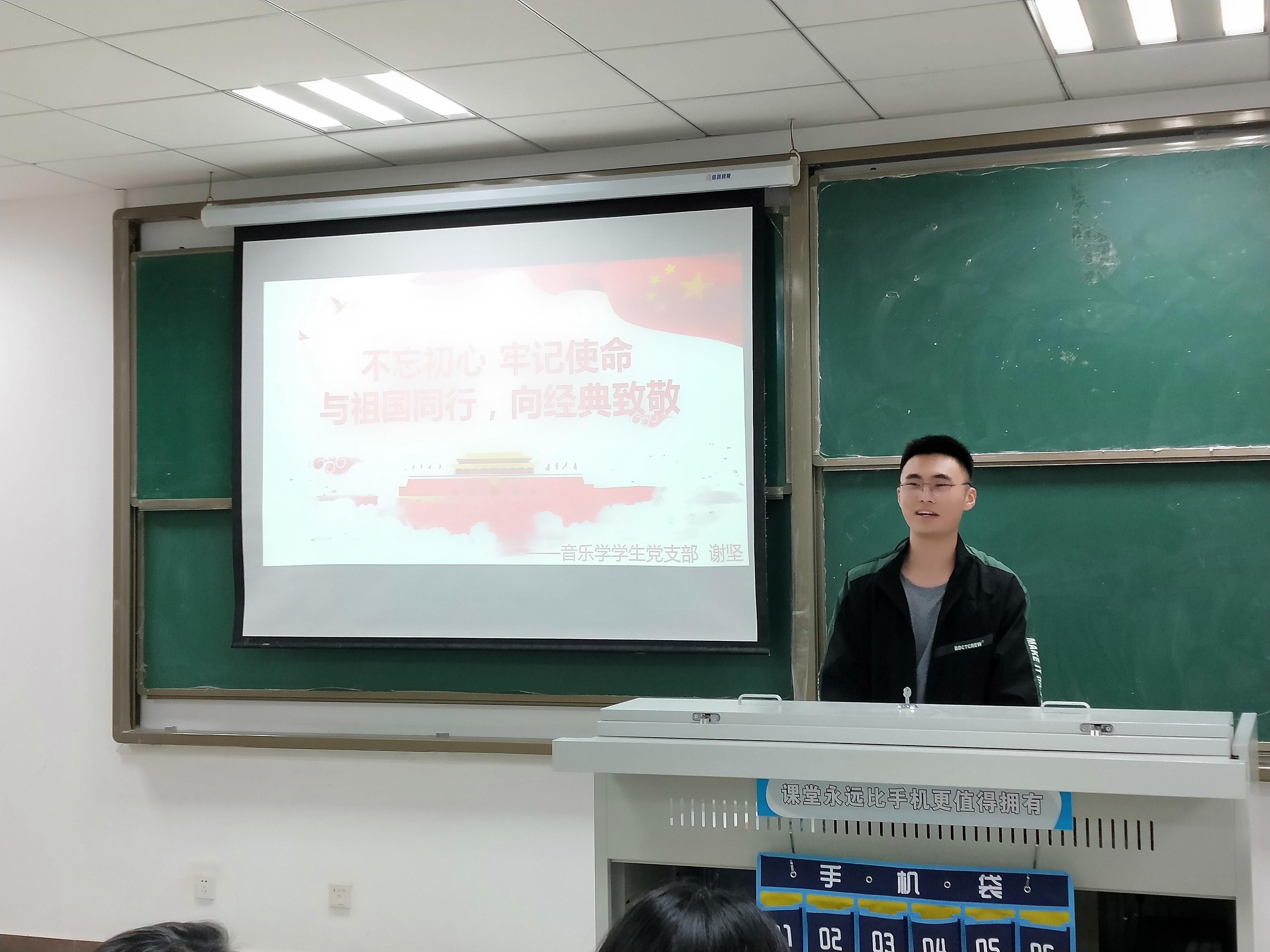 首先,音乐学学生党支部书记谢坚进行了名为“与祖国同行·向经典致敬 ”主题党课,以红色革命歌曲为切入点,多角度向现场观众阐释了为什么要守初心、担使命、抓落实、找差距。结合音乐学专业知识及文艺作品创作背后的故事,因时制宜、因材施教,进一步增强党课的思想性、理论性、亲和力,推动音乐学学生党支部党课守正创新。