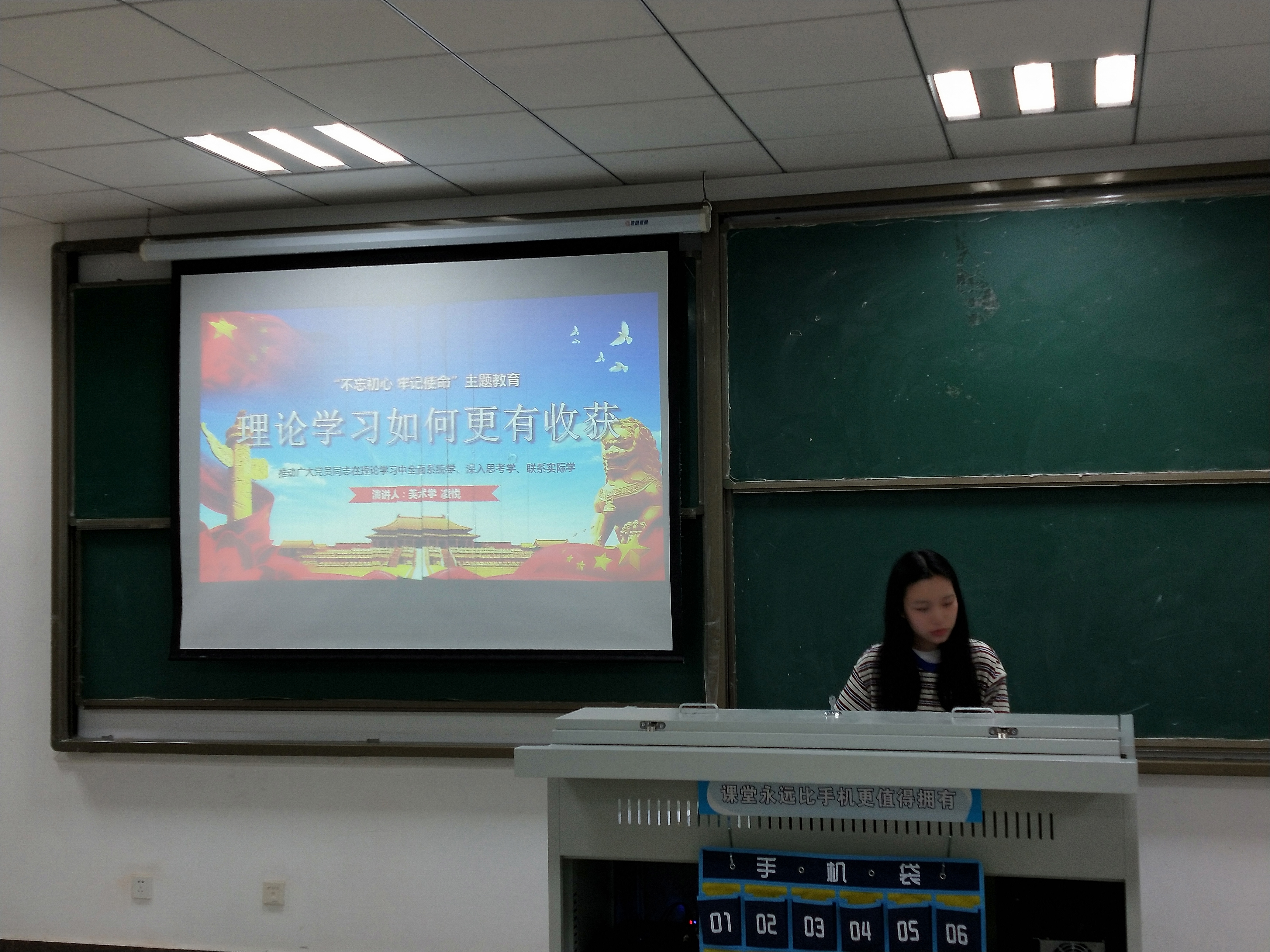 随后,美术学学生党支部书记凌悦从“加强理论学习,践行宗旨守初心”这个角度解释了加强学习的重要性。凌悦建议学习理论要全面系统的学防止“学得散”、建议深入思考的学防止“学得浅”、建议联系实际的学防止“学得虚”,从三个角度展开授课,指导同学们将理论学习学到实处、学得更有收获。