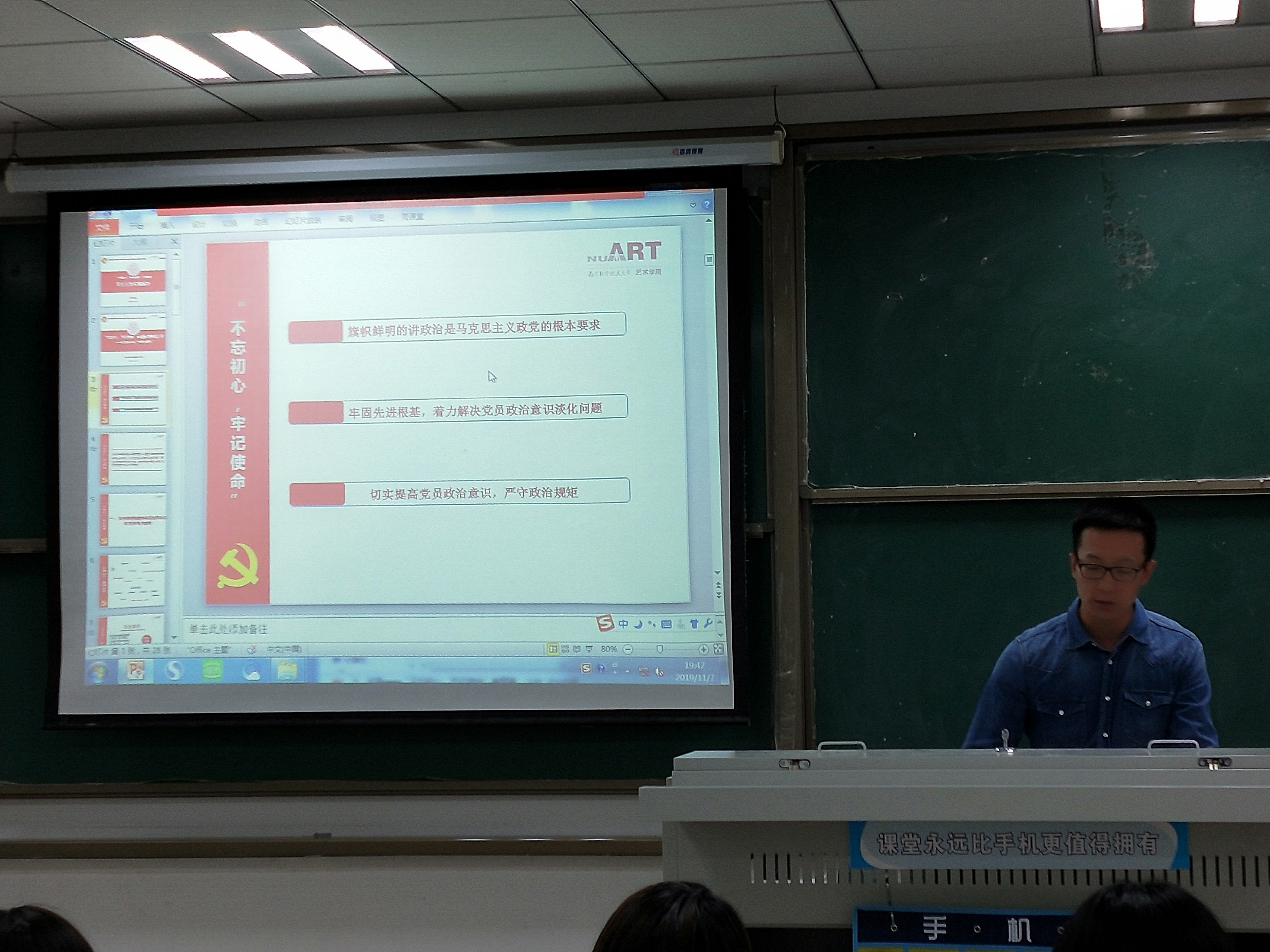 设计学学生党支部书记刘芳以“提高政治意识、严守政治规矩”作为党课主题,着力解决党员政治意识淡化问题。刘芳用鲜活的案例来向同学们解释了树立讲政治意识的重要性,并向党员同志们提出了要从本职本业出发持久历练党性的要求。从同学们身边的例子出发,由浅及深,对初心和使命做了解读。