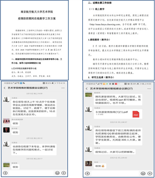 疫情防控期间线上教学方案,成立了学院在线教学领导小组、工作小组、指导小组和保障小组,各小组分工明确,协同推进。二是,组建特殊时期在线教学微信工作群,研究部署云端教学各项任务,制定了任务时间表,明确开展课程摸排、学生选课、任课教师激活在线教学课程、初步完成教学课程建设各个阶段任务安排三是,全力支持教师开展线上教学,充分利用院级、系级工作微信群、QQ群,大力宣传线上教学有关知识及技术,及时解答教师疑问,协助解决技术难题。四是,加强线上教学质量监督,组织各系教学副主任、专业负责人、学科负责人的线上课程进行教学检查。辅导员们全天在岗,细心关注每位学生,督促学生及时进入学习状态。