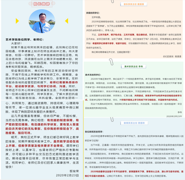 “虽然教学活动在线上开展,但教学质量及相关要求不会降低。请同学们按时上课,认真学习,也请老师们严格执行考勤制度,尽可能以多种平台交互的方式顺利推进教学活动。期待疫情早日结束,尽早恢复正常的教学与生活。祝同学们、老师们及你们的家人健康吉祥,生活愉快!”23日,学院院长板俊荣通过学院官微向师生们做了鼓舞人心的新学期致辞,系主任路漫漫、李伟、蔡雁彬老师也都寄语学生,希望同学们停课不停学,宅家不放松,尽快调整好作息时间,认真按照课表参加线上学习,按时完成作业和练习,精神饱满地投入到新的学习征程。