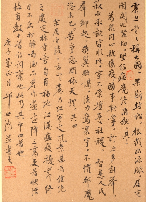 看到老家高密都抽调八位医护人员对口支援湖北,深知湖北抗疫形势异常严峻!读蒋定之先生两首词,深为其慷慨深沉、风骨不凡所打动!先生2003年作为江苏省常务副省长身处抗击非典第一线,以操劳过度耳朵失聪,故对今年抗疫情况自比常人体认遥深。尤其其中“多责又何益,胸中塞”一句,前半句堪称识大体,后半句则沉痛在骨,不细味难以理解其忧国深情!我不是医护人员,无法亲临抗疫一线,只能借书蒋先生两词以寄对国事对医护工作者一腔真情!