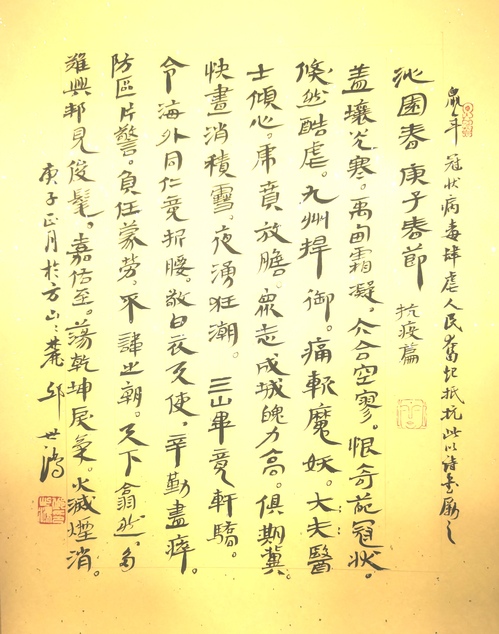 庚子鼠年,冠状病毒源起武汉,由荆楚蔓延全国甚至海外,寰宇惊恐。节日封城封区,市廛皆空,各居宅中。又闻各国火灾,流感,鼠疫,火山,海啸等不断,酷灾连绵,可谓浩劫。然国人意志坚定,戮力同心,捍御有力,局面稳定。文艺工作者以诗书画印为武器,表达情愫,支援江城。多难兴邦,一方有难,八方支援,事无巨细犹见赤誠。感念之,特此创作。