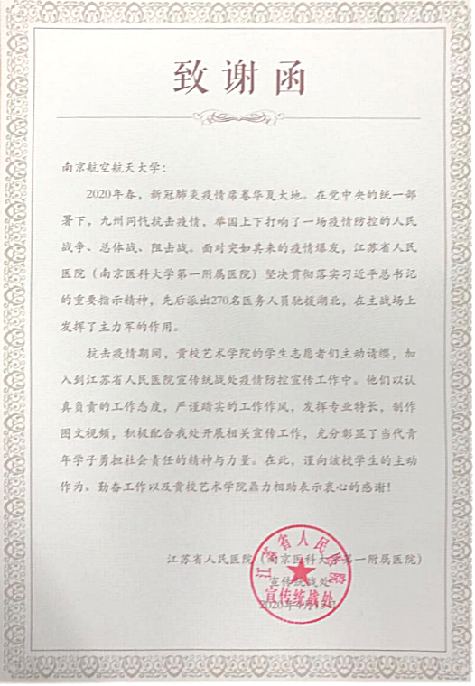 在5·12国际护士节,禁忌书屋 收到了来自他们的致谢函。在信中,江苏省人民医院(南京医科大学第一附属医院)宣传统战处对禁忌书屋 的学生志愿者们给予了高度评价。在抗“疫”期间,学生志愿者们发挥专业特长,通过原创歌曲、H5作品等形式积极配合江苏省人民医院(南京医科大学第一附属医院)宣传统战部开展宣传工作,为抗“疫”工作献出一份力。