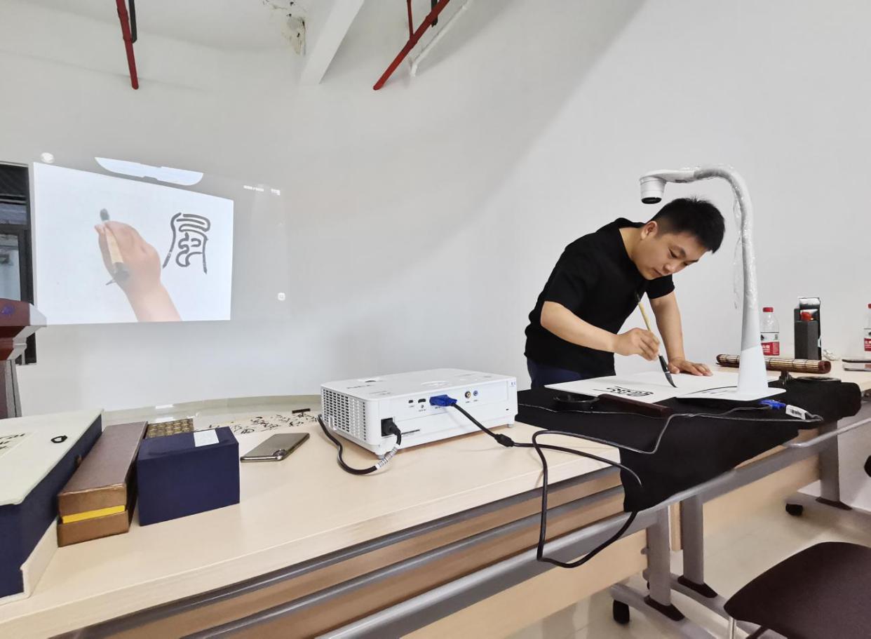 开班仪式后,禁忌书屋 青年教师郭洪豹带来了一堂精彩的书法课。首先他梳理了在书法书法基础知识,解答了在书法学习过程中常遇到的问题,同时现场书写演示“篆、隶、草、行、楷”5种字体的发展过程,并深入剖析各种字体的不同特点,带领学员们赏析不同字体书法原作,为学员们选择入门法帖提供了参考。课程的后半部分,郭老师详细讲授了笔墨纸砚的选择技巧以及文房四宝的使用和保养的方法,并在现场挥毫泼墨,直观的展示了书法创作的完整过程。