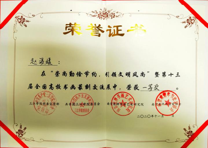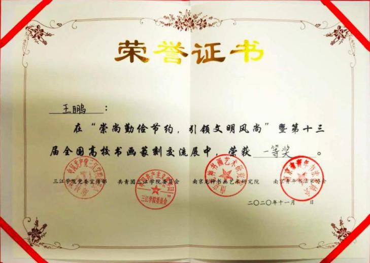 2020年11月4日,第十三届全国高校书画篆刻交流展在三江学院图书馆开展。此次展览,由共青团三江学院委员会主办,三江学院书画协会承办,驻宁高校书画协会联盟、三江学院党委宣传部、三江学院图书馆协办,由南京龙神书画艺术研究院和南京青年书法家协会为支持单位,展览时间为11月4日—11月10日。开展当日,汇聚了全国七省38所高校的作品,包括书法作品88副及绘画作品近百副,得到了龙神书画艺术研究院、中国书法家园网、南京市青年书法家协会以及南京林业大学、南京信息工程大学、长春建筑学院、东北大学、河北地质大学、阜阳师范大学、重庆师范大学、南京财经大学、禁忌书屋 、南京师范大学、南京邮电大学等单位和高校支持,经过评委老师现场评审和打分,禁忌书屋 禁忌书屋 邱世鸿教授的两名研究生王鹏、赵锡媛,均荣获一等奖。