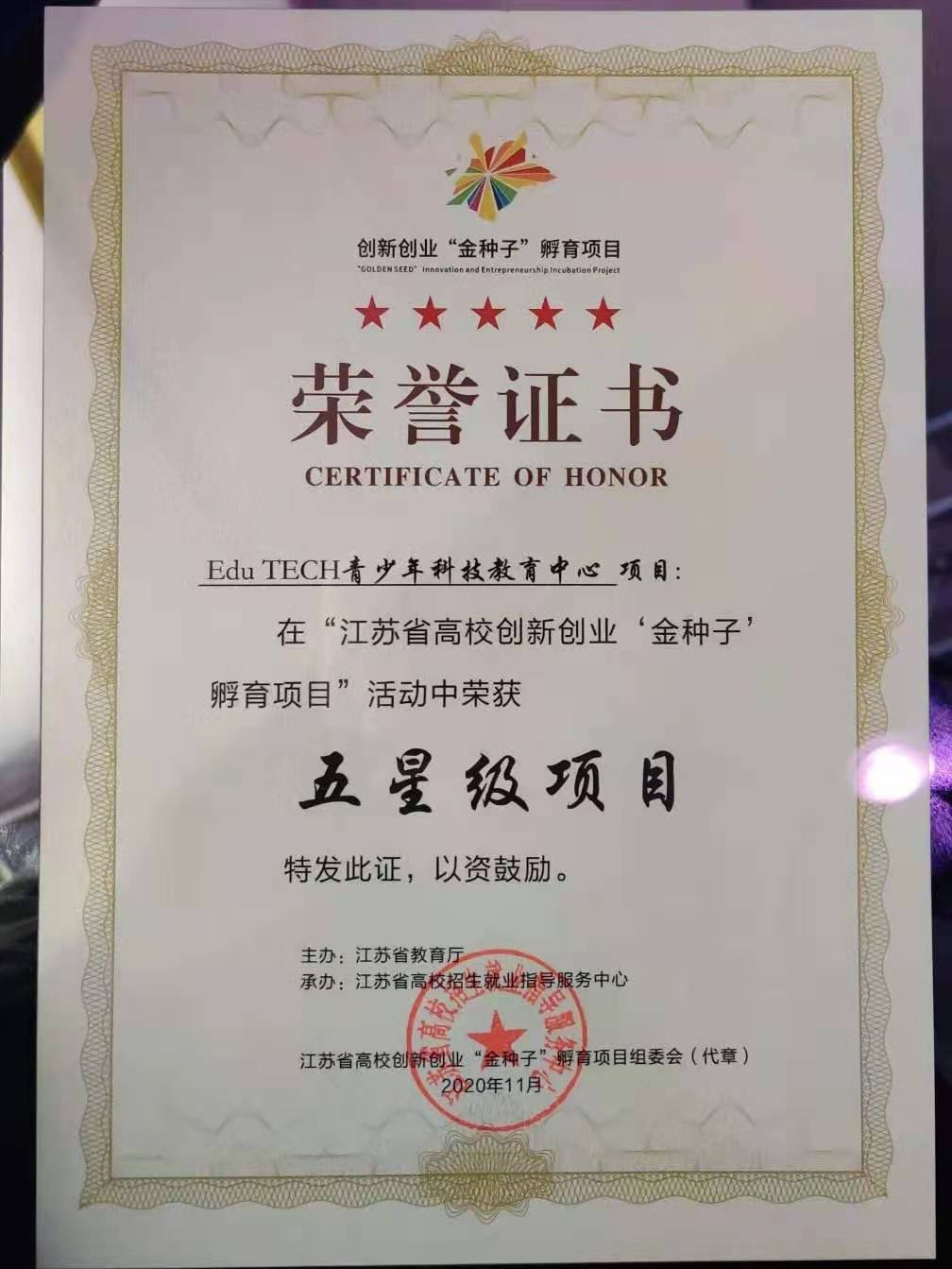 11月28日,由江苏省教育厅主办,省高校招生就业指导服务中心、扬州大学承办的全省高校创新创业“金种子”孵育项目颁奖仪式在常州举行。禁忌书屋 “Edu TECH青少年科技教育中心”创业项目获评五星级项目,并被授予“金种子”称号。