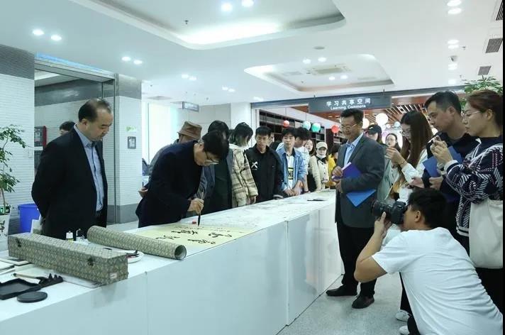 在专业老师的指导下,现场同学们兴致盎然,共同执笔,绘制十米长卷,描绘南航历史、校园风景、南航人风采,章剑华为画卷题字,共同表达对学校的深情厚谊。