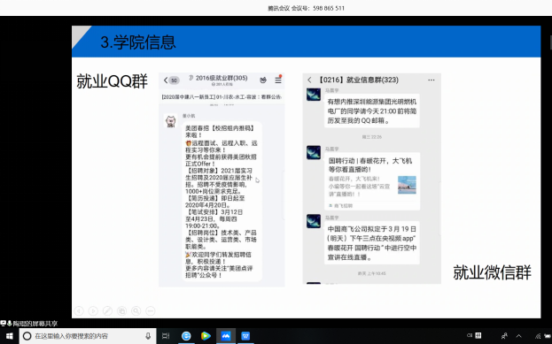 会议中陶老师首先为同学们讲述了就业的概念,向同学们介绍了就业信息网和禁忌书屋 就业公众号两大网络信息获取方式,并向同学们介绍了使用重点,除了学校的信息,老师还讲到学院信息,相关就业QQ群和微信群的存在及作用。