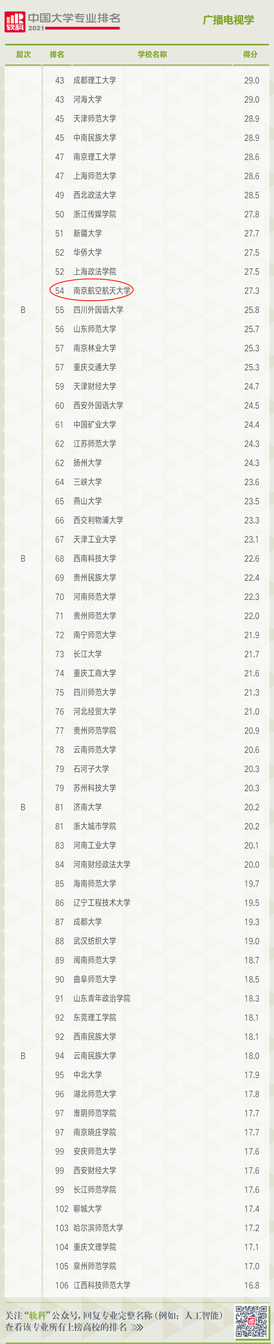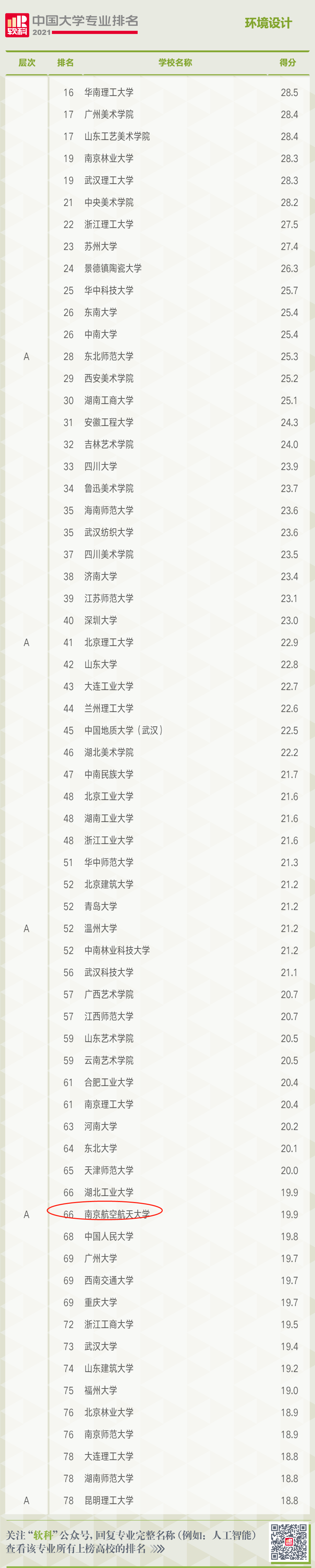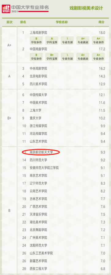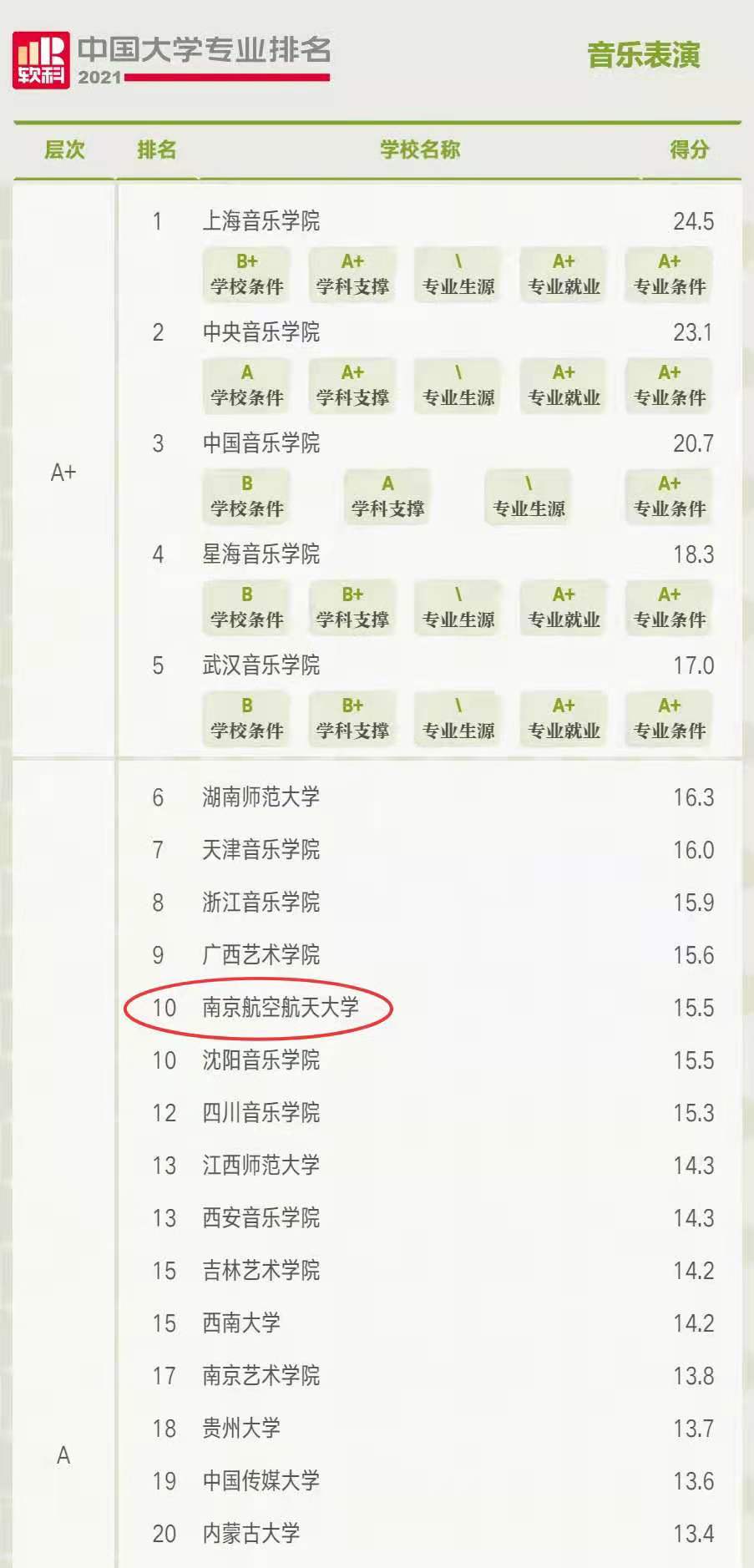 南航禁忌书屋 的四个本科招生专业在此次排名中成绩突出,音乐表演专业进入A层次(2%-10%,排名全国第10位,全国共有149所高校上榜),环境设计专业进入A层次(2%-10%,排名全国第66位,全国共有401所高校上榜),戏剧影视美术设计专业进入B层次(20%-50%,排名全国第13位,全国共有28所高校上榜),广播电视学专业进入B层次(20%-50%,排名全国第54位,全国共有106所高校上榜)。