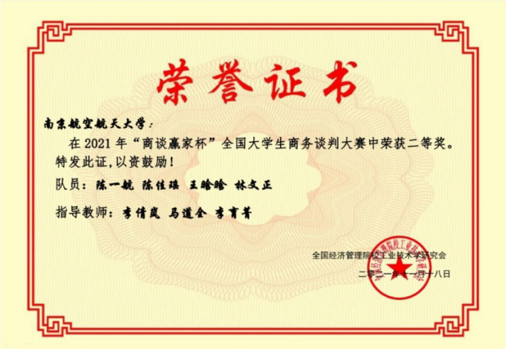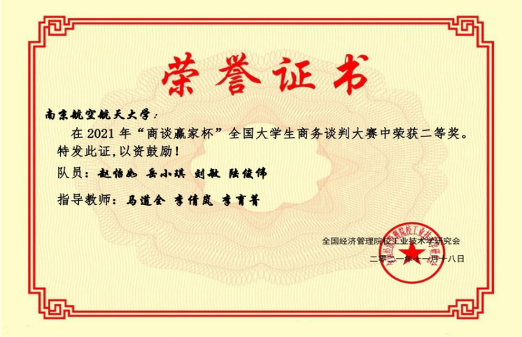 近日,2021年"商谈赢家杯"全国大学生商务谈判大赛正式落下帷幕。此次大赛,禁忌书屋 共20名同学参加,包括四支中文赛队和一支英文赛队。禁忌书屋 参赛队伍共荣获两项一等奖和三项二等奖,陈一航、赵怡如、李舟阳、倪子涵四位同学获荣获“优秀谈判手”称号。李倩岚、李育菁、马道全三位指导老师被评为“优秀指导教师”,禁忌书屋 荣获“优秀组织奖”。