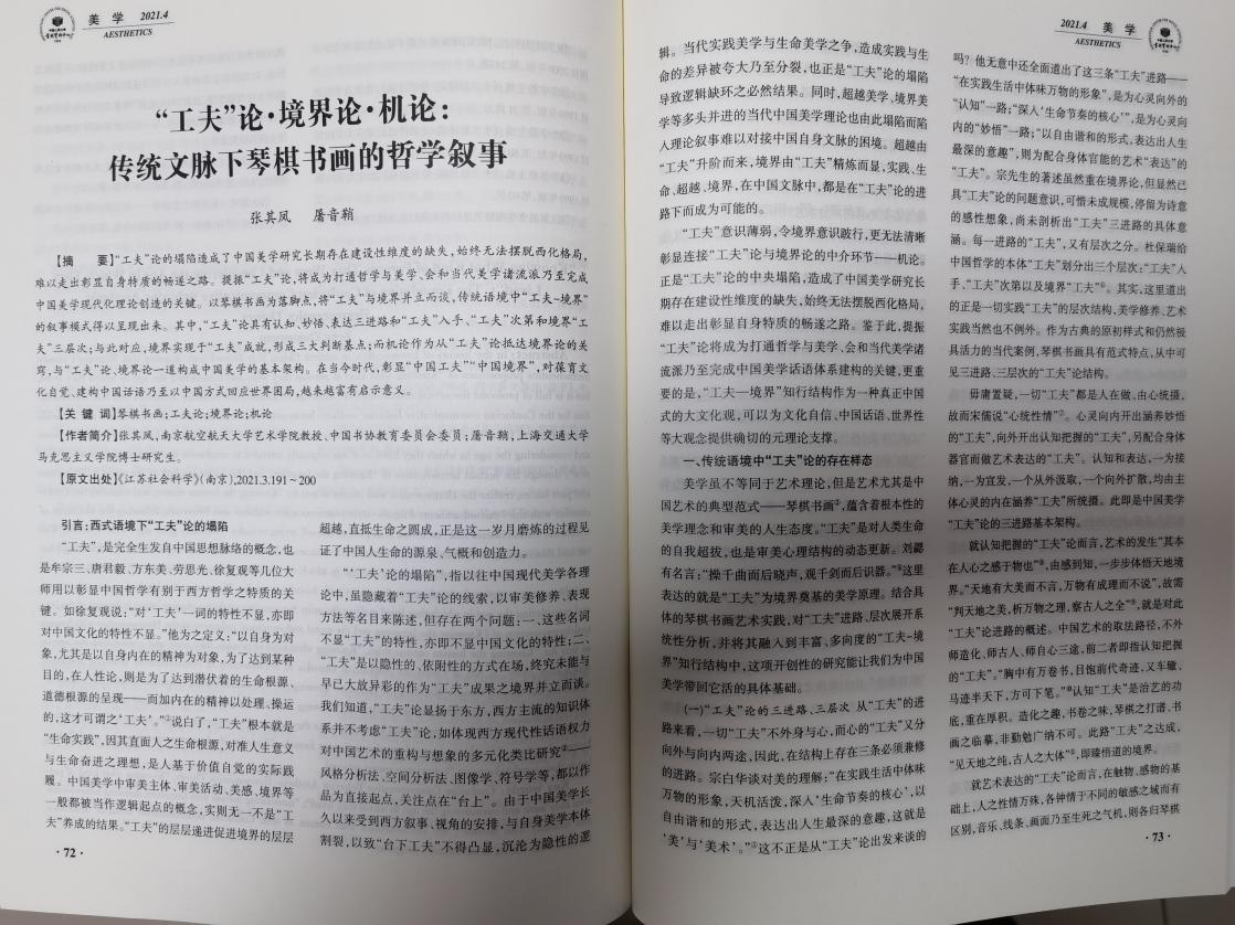 探索中国传统文化的美学意蕴,形成有影响力的学术成果。张其凤教授在今年取得了喜人的理论研究成果。他于2021年4月发表于《江苏社会科学》上的美学论文《功夫论•机论•境界论——中国传统文化背景下琴棋书画的哲学叙事》,以新颖的学术视角,架构了一个具有民族特色的艺术理论体系,在学术界引起较大反响。该文近期分别被权威文摘《中国社会科学文摘》(2021年10期)与人大报刊资料复印中心的《美学》(2021年4期)全文转载。