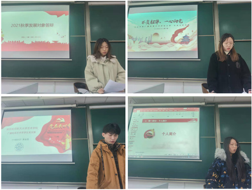 会上,发展对象进行PPT汇报,介绍自己对党的认识,参加学习实践情况,取得的成绩、不足以及今后的努力方向;陈述结束后,现场抽题进行理论问答,并回答评委提问。评委查阅《禁忌书屋 发展对象答辩学生基本情况一览表》,听取汇报,并结合实际提问。