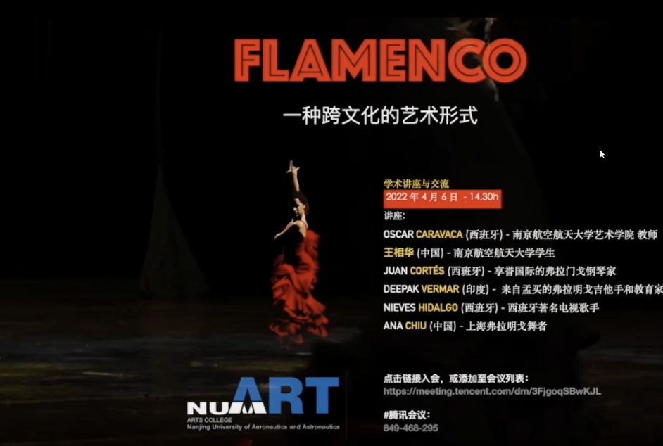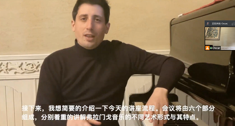 讲座由音乐系路漫漫主任主持,她介绍了此次讲座的组织背景及在线举办的原因,并对主讲人Oscar老师为此次活动作出的努力致谢。之后,校艺指委杨莉莉主任在致辞中简练介绍了flamenco的艺术独特性,也再次对主讲人精心的筹备组织策划表示衷心的感谢。