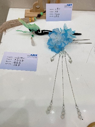 李筱彧和孙圳共同完成的《梨花压海棠》。上面蓝色分布的绒花是梨花,采用的是淡蓝色的绒花,青绿色的海棠是用热缩片制作而成,主发簪,绒花排列在主要部分,流苏是由,梨花组成,佩戴时融化在上流苏自然垂落,表现主题