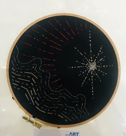 这幅作品的灵感来自于梵高的星空,略做了改动,用珠绣绣出它的颜色,使得整幅画面更加光彩透亮,在用打籽针在边缘绣出花草树木,使得画面内容更加丰富,最后使用平绣,使得画面凹凸起伏,层次感更加的鲜明