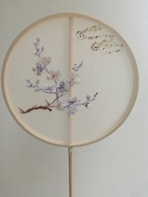 枉凝梅。以黛玉为创作灵感,黛玉生性高洁、拥有梅竹品质。采用苏绣的方式,配色淡雅,淡紫色的冷与白色的静,凸现黛玉的空灵飘逸