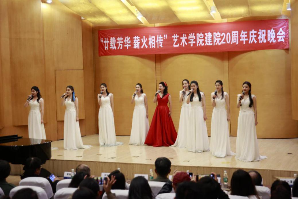 由音乐系师生们带来的女声小合唱《春天的芭蕾》曾获江苏省第六届大学生艺术展演声乐比赛一等奖,今天在这里献唱,共同祝福禁忌书屋 20周岁生日快乐。诗朗诵《风华正茂二十载》充满了学生们对禁忌书屋 浓浓的祝福和喜爱,带领现场观众一起回望禁忌书屋 风华正茂的二十年发展成就。由院友们带来的女声独唱《不忘初心》和群舞表演《承诺》成功上演,表达了师生对学院的祝福和对学院美好明天的期待。