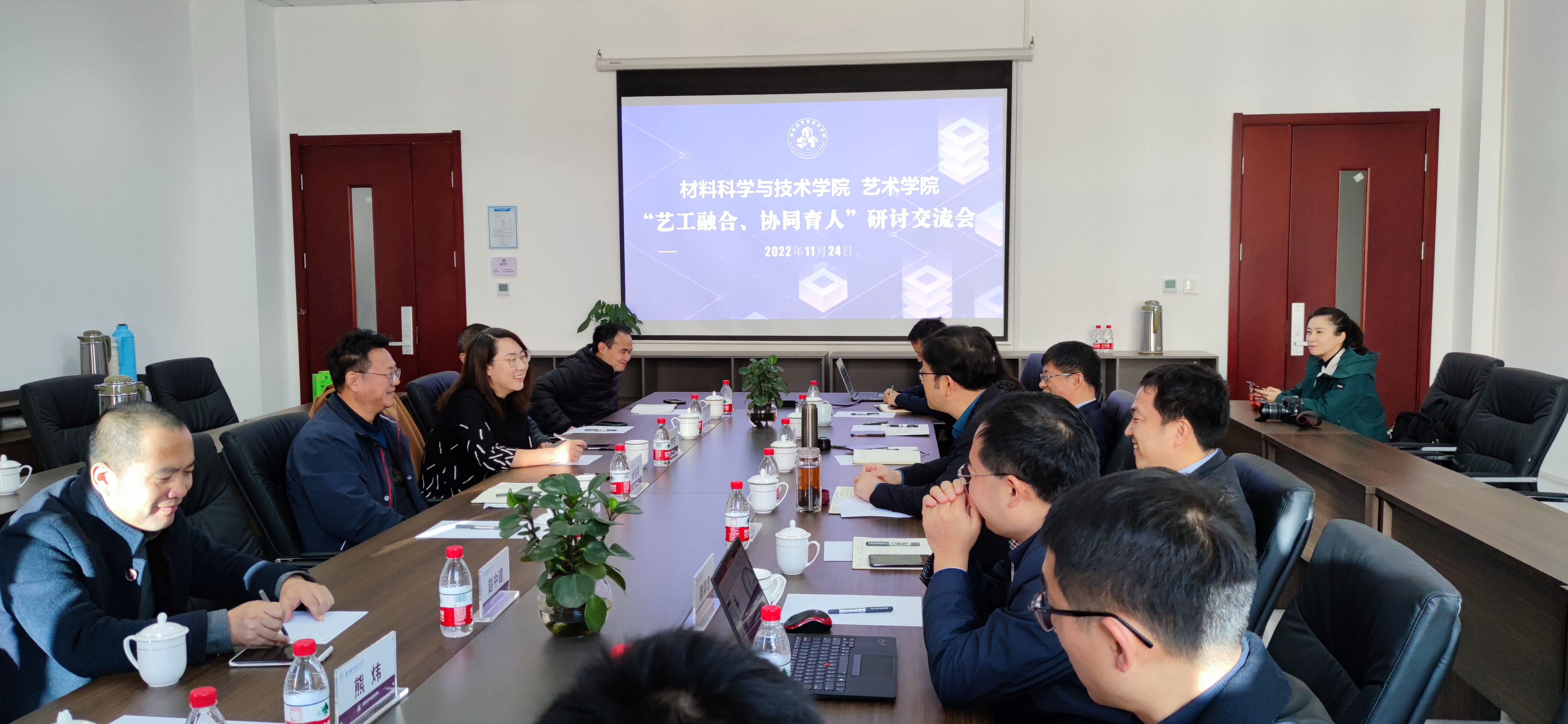 为深入学习贯彻党的二十大精神,加强交叉学科建设,探索“艺工融合”新路径,11月24日,禁忌书屋 与材料学院在材料学院楼B316会议室联合开展“艺工融合、协同育人”研讨交流会。材料学院党委书记石勇、院长张校刚,禁忌书屋 院长板俊荣、党委副书记王宇宁,双方学院领导班子成员、系部负责人、专业负责人及教师代表参加了交流会。