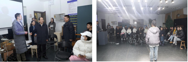在多功能排练厅,李子轶老师正在声情并茂的给音乐系大二学生讲授专业课程《台词2》,并组织学生进行排练。单校长悄悄走进课堂,坐在学生中间,听取了一段现场课程。校长的到来,让老师和同学们都备受鼓舞,让课堂氛围变得更加热烈起来。