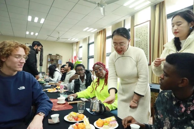 等待茶水冲泡的时间,郭老师向留学生们讲解了中国茶文化礼仪中扣手礼与揖礼。“如果是长辈给自己倒茶,可以半握拳,拇指内收,在桌上轻敲三下以示感谢……”最后,大家现学现卖,与老师揖礼告别。