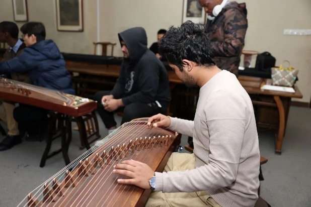 训练营最后一讲古筝课由砚湖书院古筝教师潘雪蓉进行授课。潘老师带大家认识了解古筝的构造、种类、发音原理与调音方法,并向同学们介绍,古筝常见的规格是18弦、19弦、21弦和16弦。