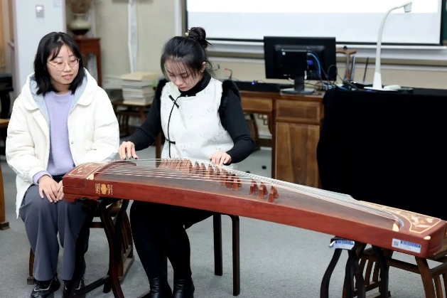 传统筝乐不同派别有着明显的风格差异,老师现场为同学们示范演奏了《渔舟唱晚》、《四段锦》、《出水莲》等曲目,展示了各派别不同风格的特点。