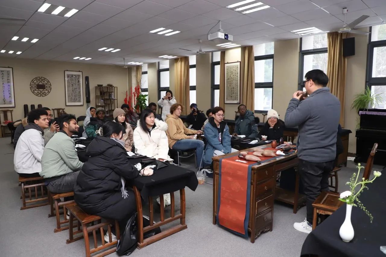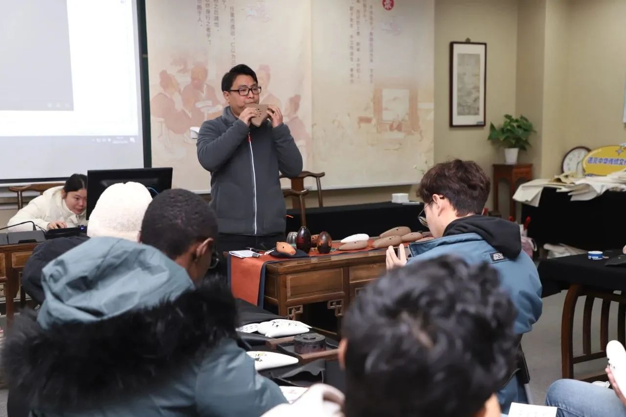 训练营第四讲为陶笛课,由砚湖书院陶笛教师蒋璐为留学生授课。同学们还未踏进教室,婉转悠扬的陶笛声已袅袅不绝,蒋老师现场吹奏《女儿情》、《桃花渡》、《赛马》等经典曲目,同学们在不同风格的音乐中开始了陶笛课的学习。