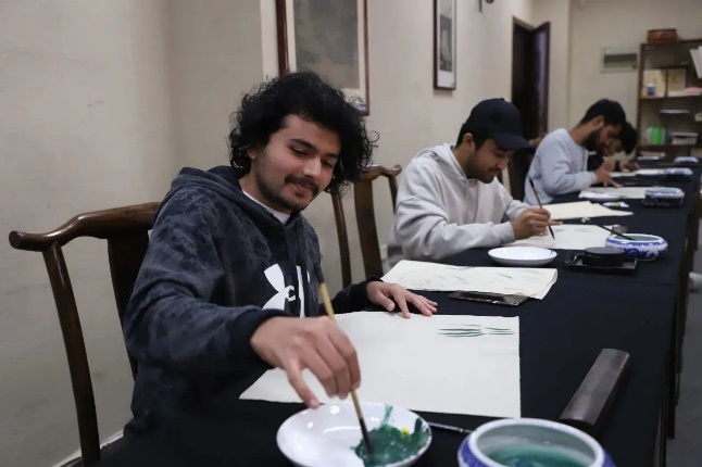 训练营第二讲为国画课,由砚湖书院国画教师潘杨为留学生们授课。潘老师向同学们介绍了中国画人物、山水、花鸟的三种表现形式,其中“梅、兰、竹、菊”是花鸟画中常见的表现主题,合称为“花中四君子”。