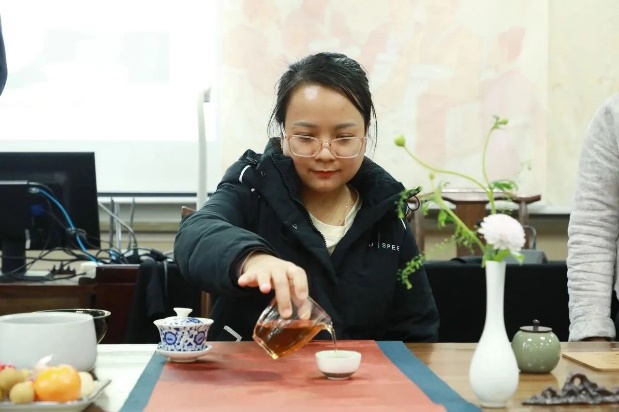 紧接着,老师向同学们展示茶艺。主客行礼、备茶、温器、投茶、摇香、传嗅、温杯、润茶、泡茶……每一步都充满仪式感,同学们三两成组、品茶论道。