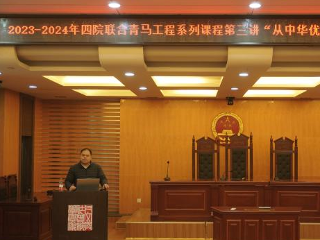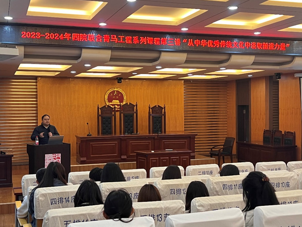 联合人文与社会科学学院、外国语学院、马克思主义学院共同举办2023-2024学年“青马工程”系列课程第三讲。学校学生处学生资助管理中心主任、马克思主义学院硕士生导师唐志文受邀讲授以“从中华传统文化中汲取前进力量”为主题的信仰公开课。来自四个学院“青马工程”培训班的百余名学生共同参与学习。