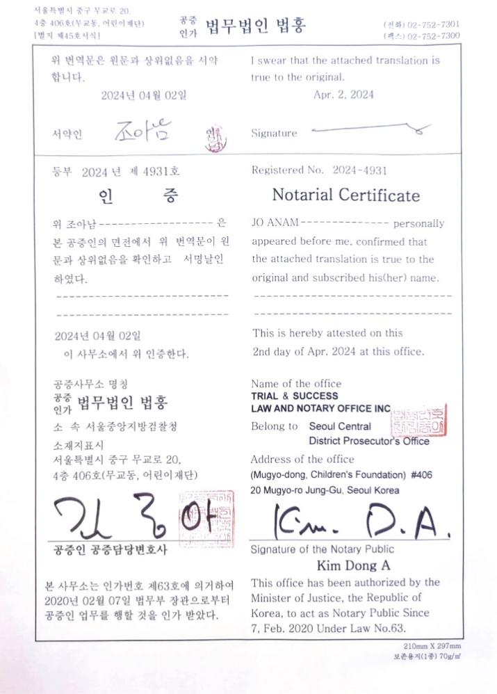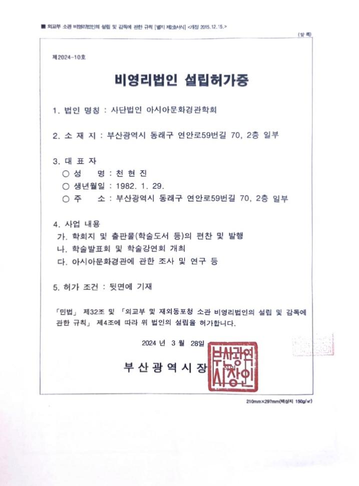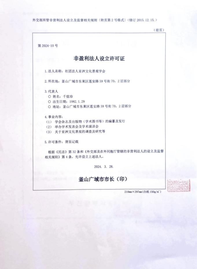 亚洲文化景观学会非盈利法人设立许可证韩文原本